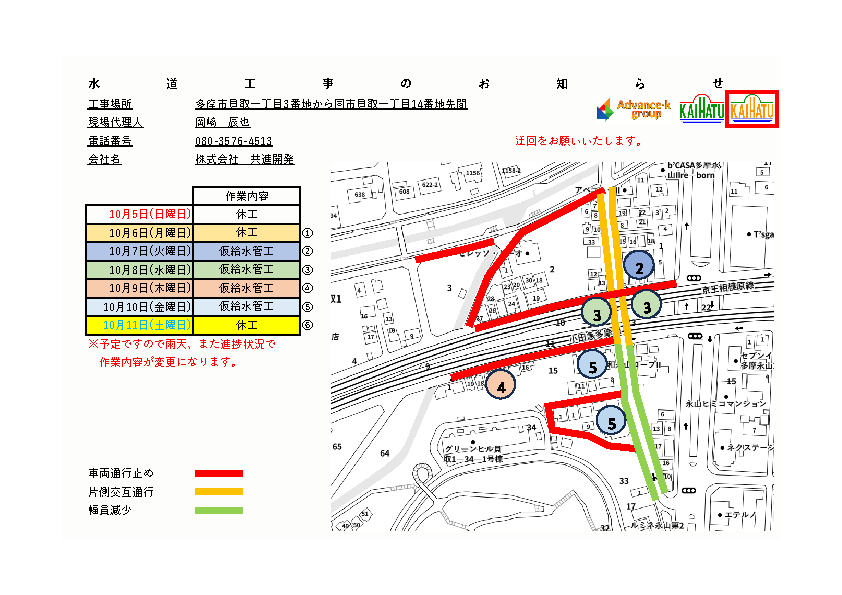 住所 | 東京都多摩市貝取一丁目3番地から同市貝取一丁目14番地先間配水小管布設替及び撤去工事 |