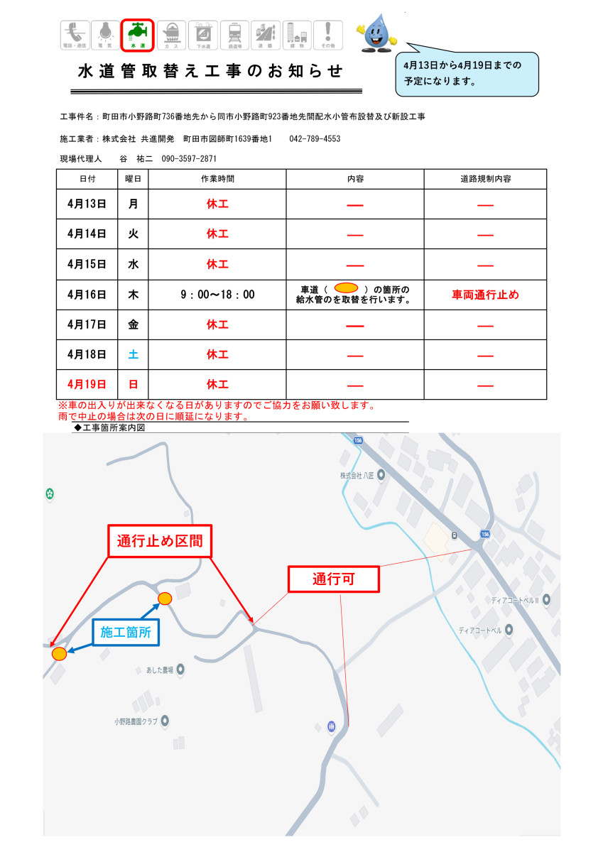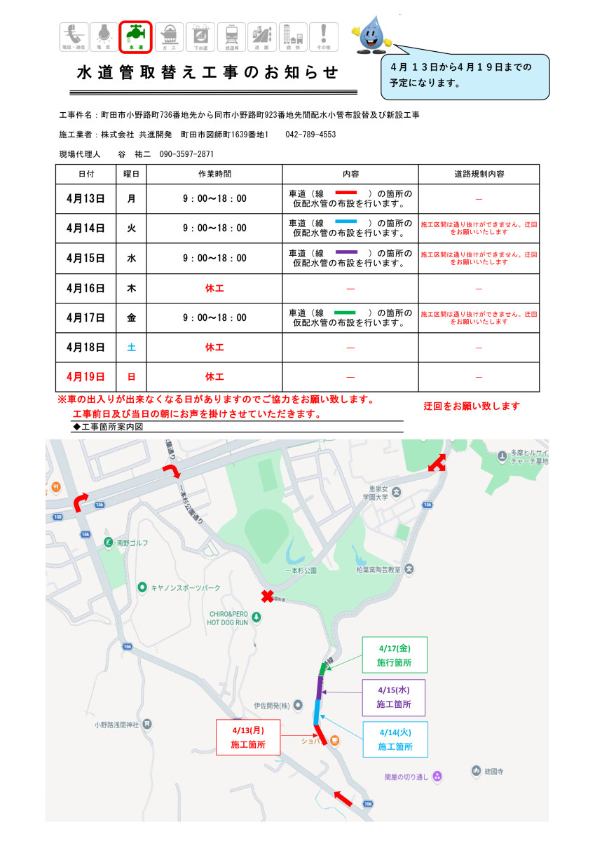 | 工事名 | 町田市小野路町736番地先から同市小野路町923番地先間配水小管布設替及び新設工事 |